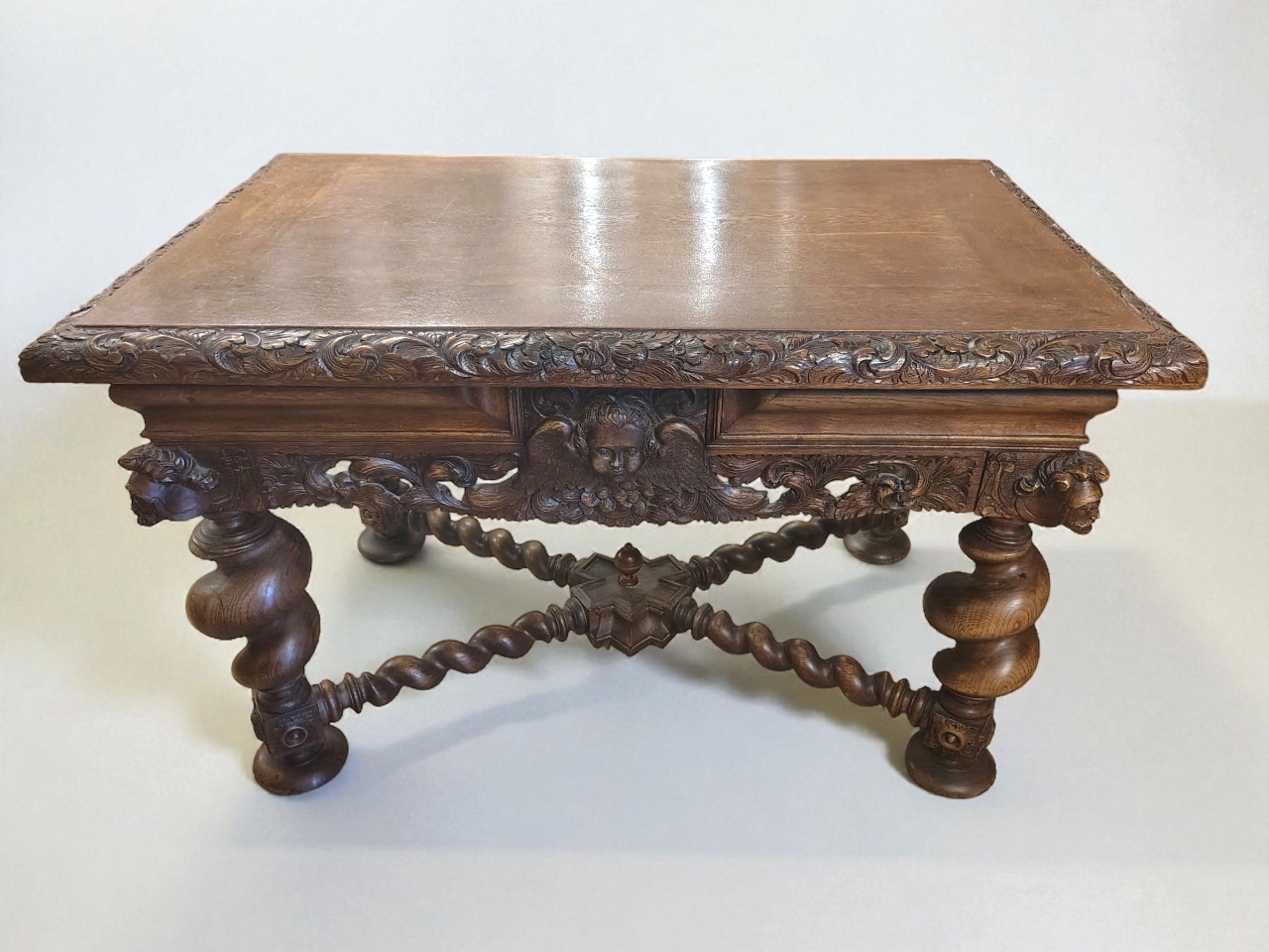 Bogato rzeźbiony, okleina dębowa na blacie i dąb masyw.